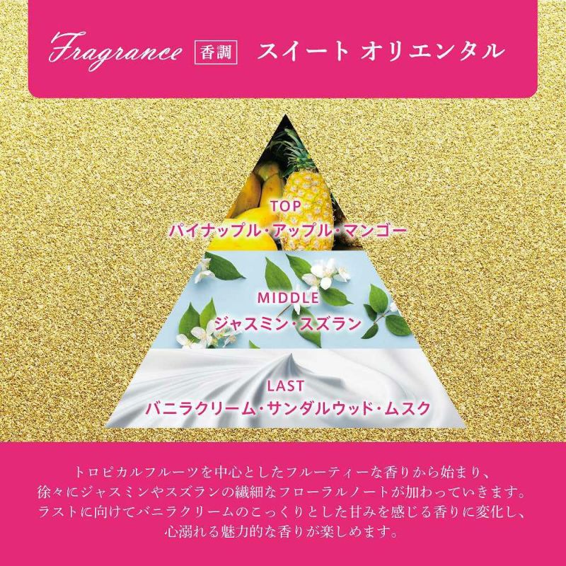トロピカルフルーツを中心としたフルーティーな香りから始まり、徐々にジャスミンやスズランの繊細なフローラルノートが加わっていきます。ラストに向けてバニラクリームのこっくりとした甘みを感じる香りに変化し、心溺れる魅力的な香りが楽しめます。
