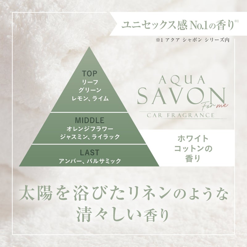 香水生まれの本格派カーフレグランスシリーズ ユニセックス感No.1の香り※ 太陽を浴びたリネンのような 清々しい香り ~香調~ トップノート:リーフグリーン、レモン、ライム ミドルノート:オレンジフラワー、ジャスミン、ライラック ラストノート:アンバー、バルサミック ※アクア シャボンシリーズ内
