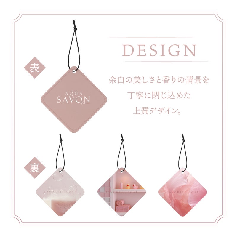 余白の美しさと、香りの情景を丁寧に閉じ込めたデザイン。 シンプルなフォルムとやさしいカラーリングで、 車内やお部屋の雰囲気を選ばず自然になじみます。 表面にはロゴのみを配し、 裏面には香りのイメージを表現したビジュアルを採用。 香りだけでなく、見た目でも心地よさを感じられる仕上がりです。