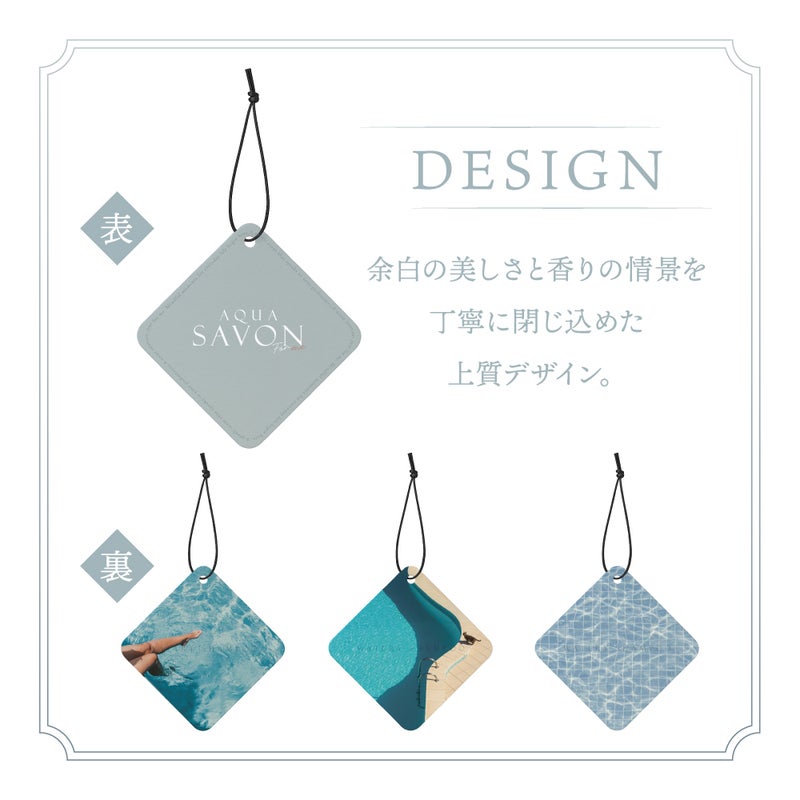 余白の美しさと、香りの情景を丁寧に閉じ込めたデザイン。 シンプルなフォルムとやさしいカラーリングで、 車内やお部屋の雰囲気を選ばず自然になじみます。 表面にはロゴのみを配し、 裏面には香りのイメージを表現したビジュアルを採用。 香りだけでなく、見た目でも心地よさを感じられる仕上がりです。