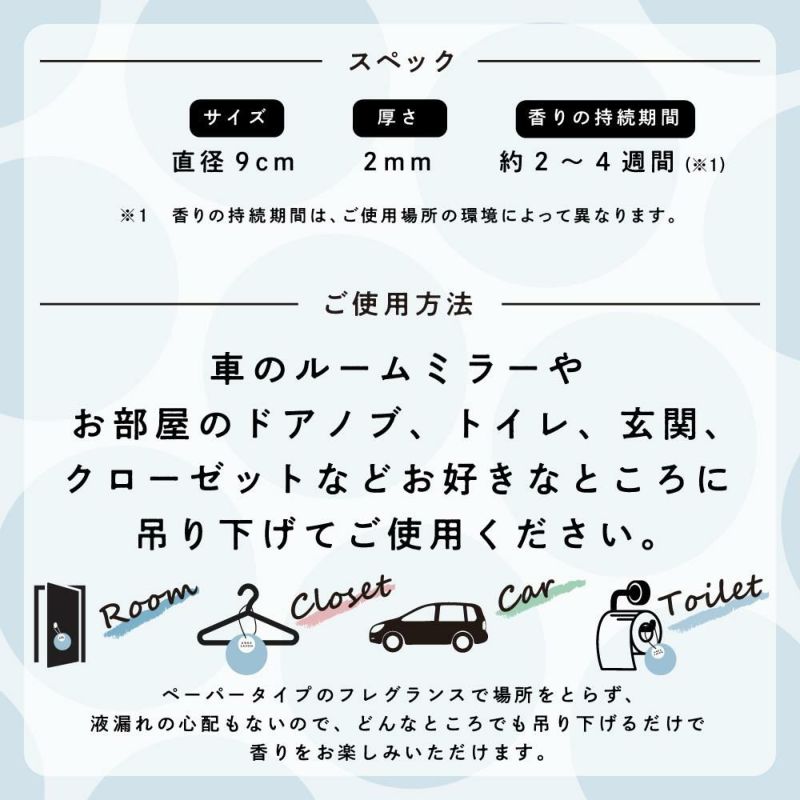 車のルームミラーやお部屋のドアノブ、トイレ、玄関、クローゼットなどお好きなところに吊り下げてご使用ください。