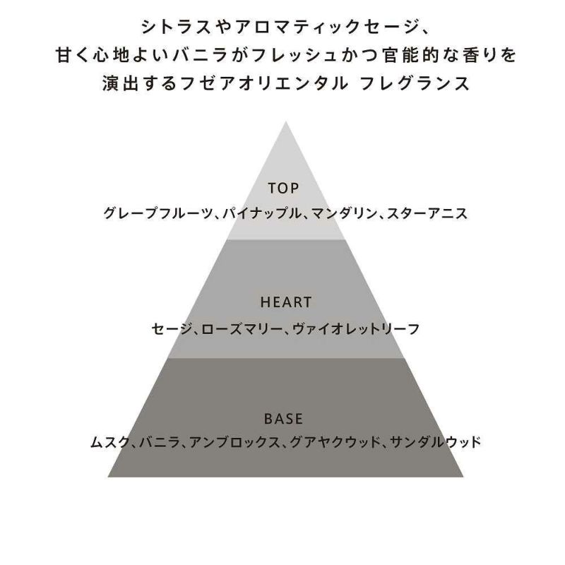 活力あふれるシトラスやアロマティックセージ、甘く心地よいバニラがフレッシュかつ官能的な香りを演出するフゼアオリエンタル フレグランス。 TOPにはグレープフルーツを使ってフレッシュさを、MIDDLEにはシャワーを浴びた後のような清潔感を、BASEにはバニラやムスクを加え、官能的な森の安らぎをイメージし多面的な男性を表現した、人生を精一杯生きる男性のためにできたフレグランスです。