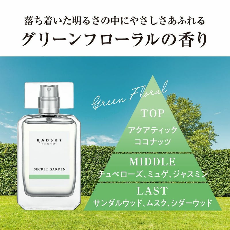 秘密の庭から見える、穏やかで澄んだ青空をイメージ。 落ち着いたウッディの中に 優しい甘さが織りなす グリーンフローラルの香り