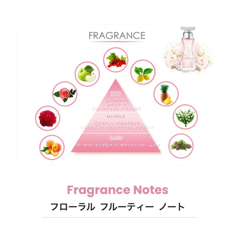 まるでローズの花びらのように、幾重にも重なった魅力的な香りが花開きます。 女性らしいホワイトフローラルの甘さで、魅力的な自分を演出できる香りが広がります。
