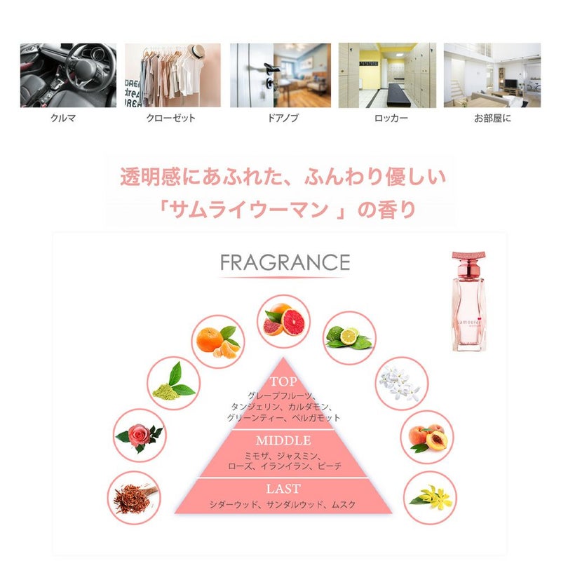 透明感にあふれた、ふんわり優しい「サムライウーマン」の香り。 現代女性の定番フレグランスの香り。 女性らしく上品なフローラル フルーティー ノートです。