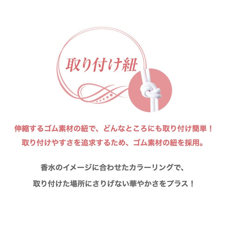 伸縮するゴム素材の紐で、どんなところにも取り付け簡単! 取り付けやすさを追求するため、ゴム素材の紐を採用。 香水のイメージに合わせたカラーリングで、取り付けた場所にさりげない華やかさをプラス!