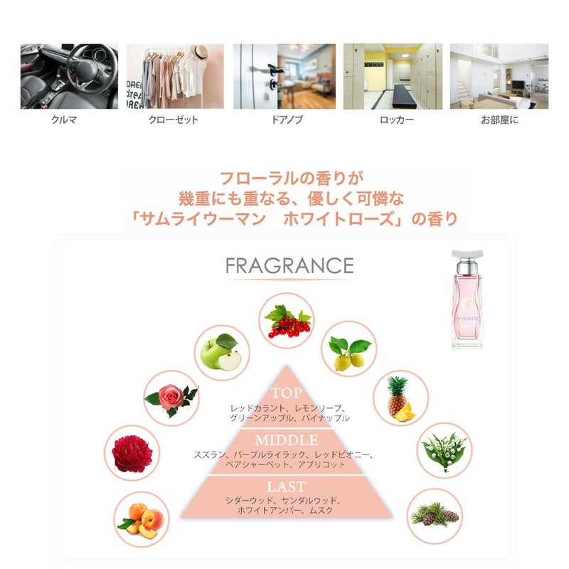 吊るすだけ簡単いい香り。車内以外にも使えるペーパータイプのフレグランス!! 香水のデザインで他にはない特別感を演出します。 サムライウーマンのフレグランスボトルをシンプルにプリント。 絶妙なサイズ感で、インテリアとしても楽しめます。