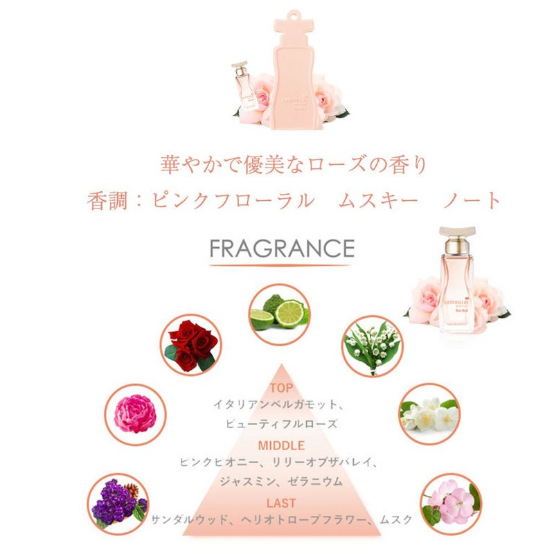 「花の女王」であるローズと、上品で気品あふれるムスクが、薔薇が咲きほこるような贅沢で優美な世界観を創り上げます。 気高く美しい中にも、暖かさが溢れるローズムスクの香りが女性の魅力を引き立てます。