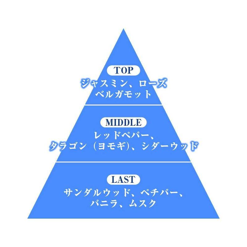 ジャスミン、ローズのさわやかで清潔感ある香りから、 心地よい安定した香りを持続させながら、 魅惑的な東洋の美しい香りになる、フレッシュアロマテックノート。 トップはジャスミン、ローズのさわやかで 清潔感ある香りによって若々しさを引き立てています。 ミドルはレッドペパーがほんのりスパイシーな 新鮮さを与えながらも、シダーによって 心地よい安定した香りを静かに持続させます。 ラストはサンダルウッドによる東洋的で 落ち着いた香りと共に、バニラの甘み、 ムスクのセクシーさを兼ね備えた魅惑的な 東洋の美しい精神を表現しています。