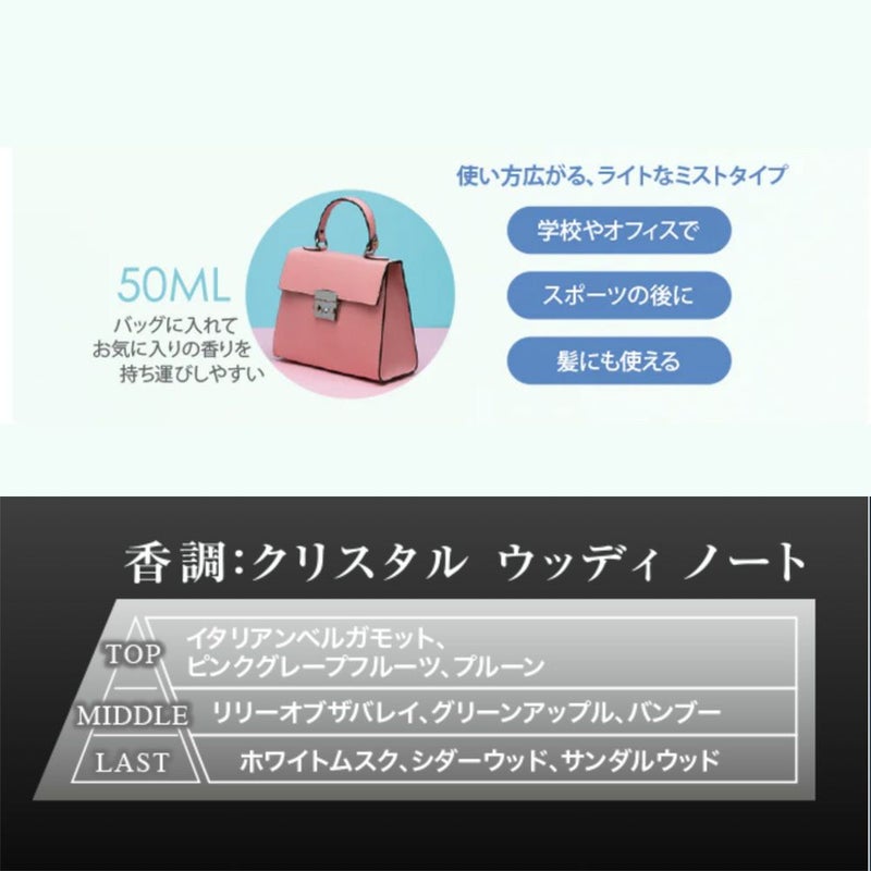 大人の甘さと清潔感のあるクリスタル ウッディの香り。フレッシュなシトラスにプルーンの甘みを折り込んだ透明感のあるトップから、ホワイトフローラルにバンブーのアクセントが効いたミドルが続き、ラストでは清潔感のあるホワイトムスクと落ちついた印象のドライウッディの香りで新しい時代の男の存在感を表します。