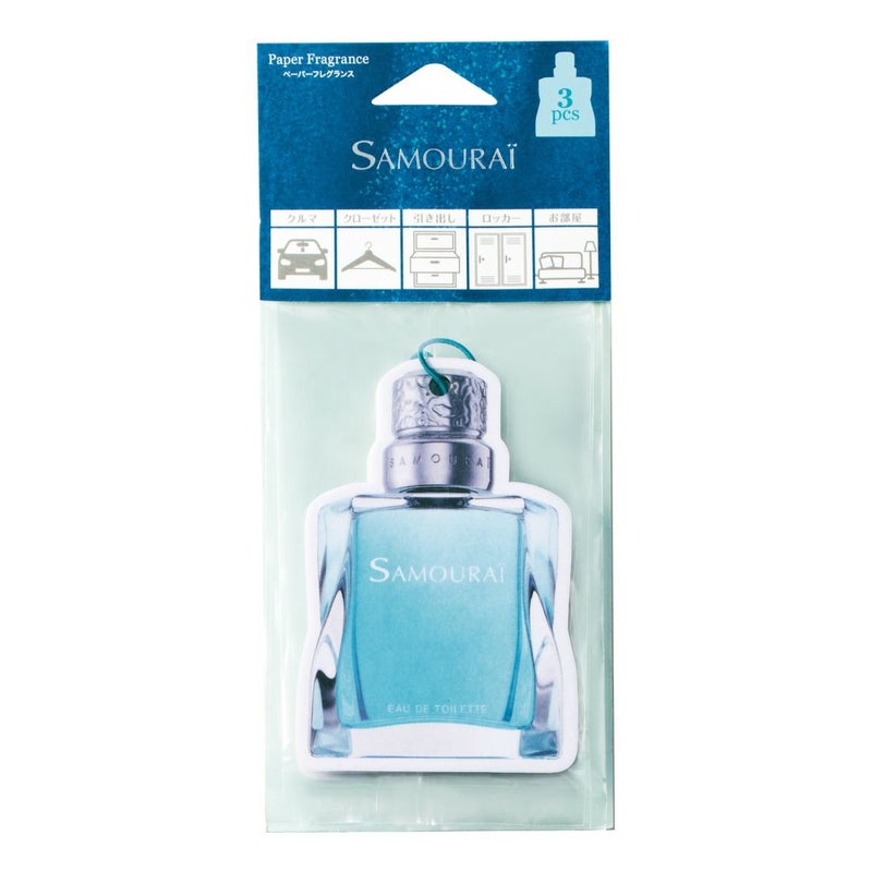 吊るすだけ簡単いい香り。車内以外にも使えるペーパータイプのフレグランス!! 香水のデザインで他にはない特別感を演出します。 サムライのフレグランスボトルをシンプルにプリント。 絶妙なサイズ感で、インテリアとしても楽しめます。