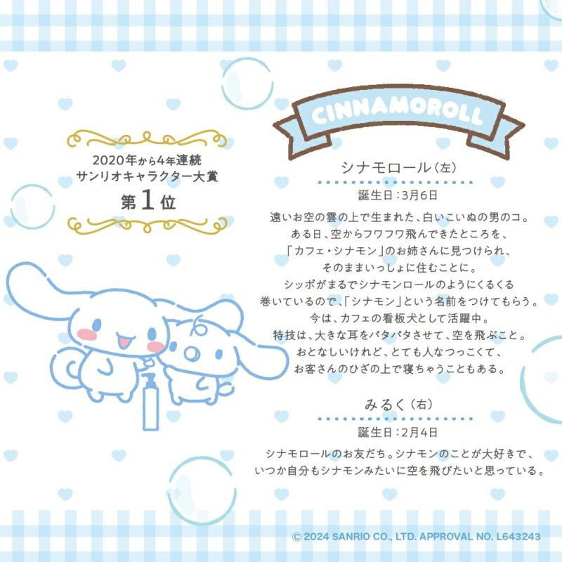 シナモロールとお友だちのみるくが一緒になった特別デザイン。爽やかなブルーのチェック柄に、小さいハートとシャボンに囲まれたシナモロールとみるくが可愛くデザインされています。