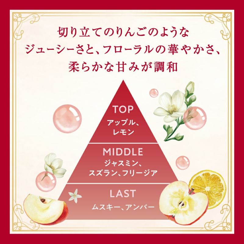 切り立てのりんごのようなジューシーさと、フローラルの華やかさ、 柔らかな甘み調和した豊蜜な香り。 やさしく甘い香りの変化は、使うたびに気分をととのえ、 まとう人の印象に透明感と華麗さを添えます。 ~香調~ TOP:アップル、レモン MIDDLE:ジャスミン、スズラン、フリージア LAST:ムスキー、アンバー