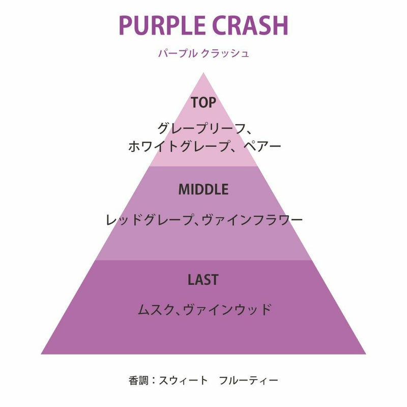 南仏の太陽を浴びたみずみずしい完熟グレープの香り。 躍動感あふれるグレープアコードを清らかですっきりとした希少なブドウ花の香りで包み込むことにより、多幸感あふれる華やかな香りに。