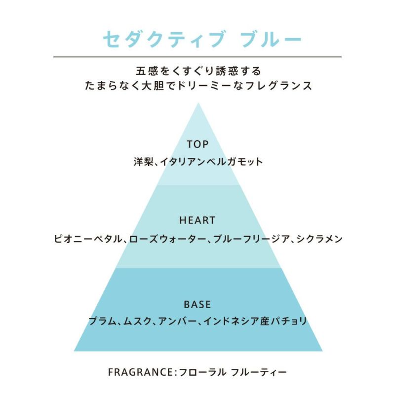 フレッシュな洋梨の生き生きとした香りから始まり、ベルベットのようなつややかな花びらのフェミニンなミドルノート、官能的なムスクとパチョリのアーシーな香りが続きます。