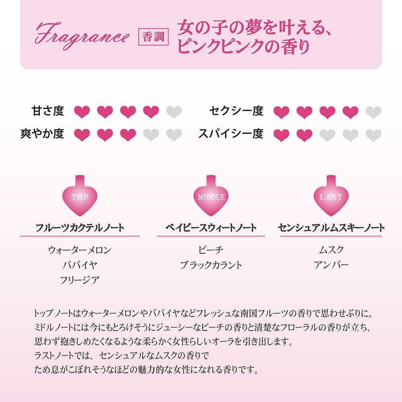 ピンクの魔香でカワイイを操る! グロッシーなハートに、鮮やかなピンク、 女の子の夢を叶える、ピンクピンクの香り。 トップノートはウォーターメロンやパパイヤなどフレッシュ南国フルーツの香りで思わせぶりに。 ミドルノートには今にもとろけそうにジューシーなピーチの香りと清楚なフローラルの香りが立ち、思わず抱きしめたくなるような柔らかく女性らしいオーラを引き出します。 ラストノートでは、センシュアルなムスクの香りで、ため息がこぼれそうなほどの魅力的な女性になれる香りです。