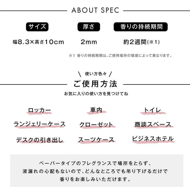 車のルームミラーやお部屋のドアノブ、トイレ、玄関、クローゼットなどお好きなところに吊り下げてご使用ください。ペーパータイプのフレグランスで場所をとらず、液漏れの心配もないので、どんなところでも吊り下げるだけで手軽に香りをお楽しみいただけます。 香りの持続期間:約2週間 (ご使用場所の環境によって異なります。)