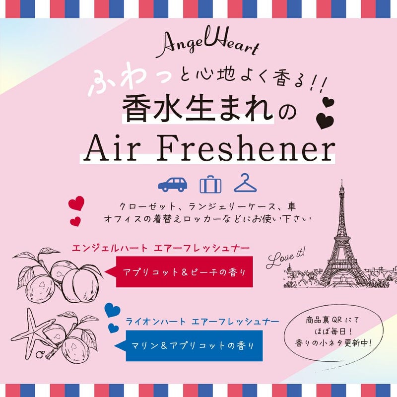エンジェルハート 愛され続けて発売20周年!大人気♥ハートのフレグランスからエアーフレッシュナーが登場!世代・年齢を問わずお部屋になじむシンプルなデザイン。時と場所を選ばない、スウィートな香りが心地よく広がるアプリコット&ピーチの香り