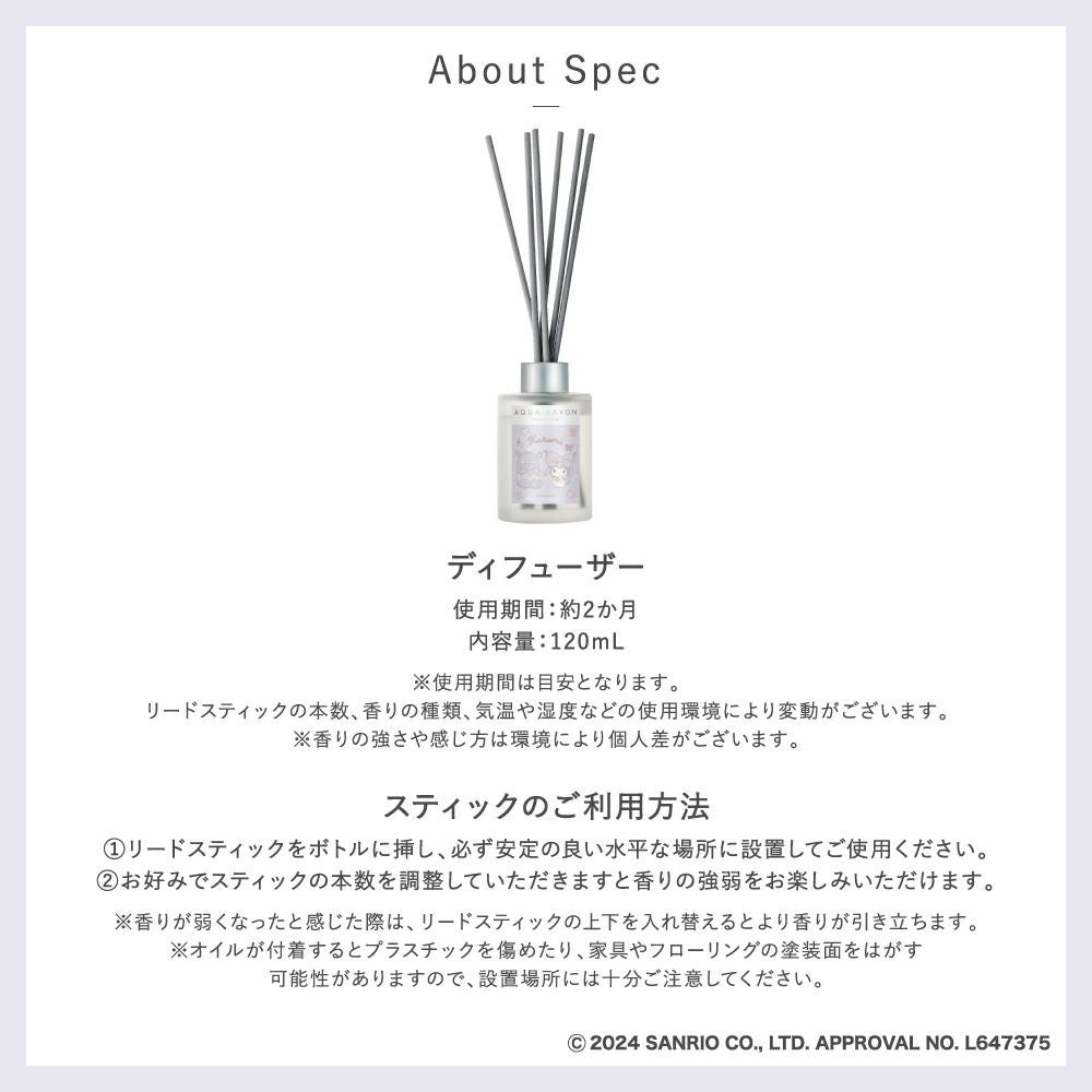 他の画像を見る 心やすらぐ、シャボンな毎日。AQUA SAVON アクア シャボン リードディフューザー ウォータリーシャンプーの香り(シナモロール 24A) 120mL 価格 ¥ 2,750 税込 在庫切れ お気に入りに登録する