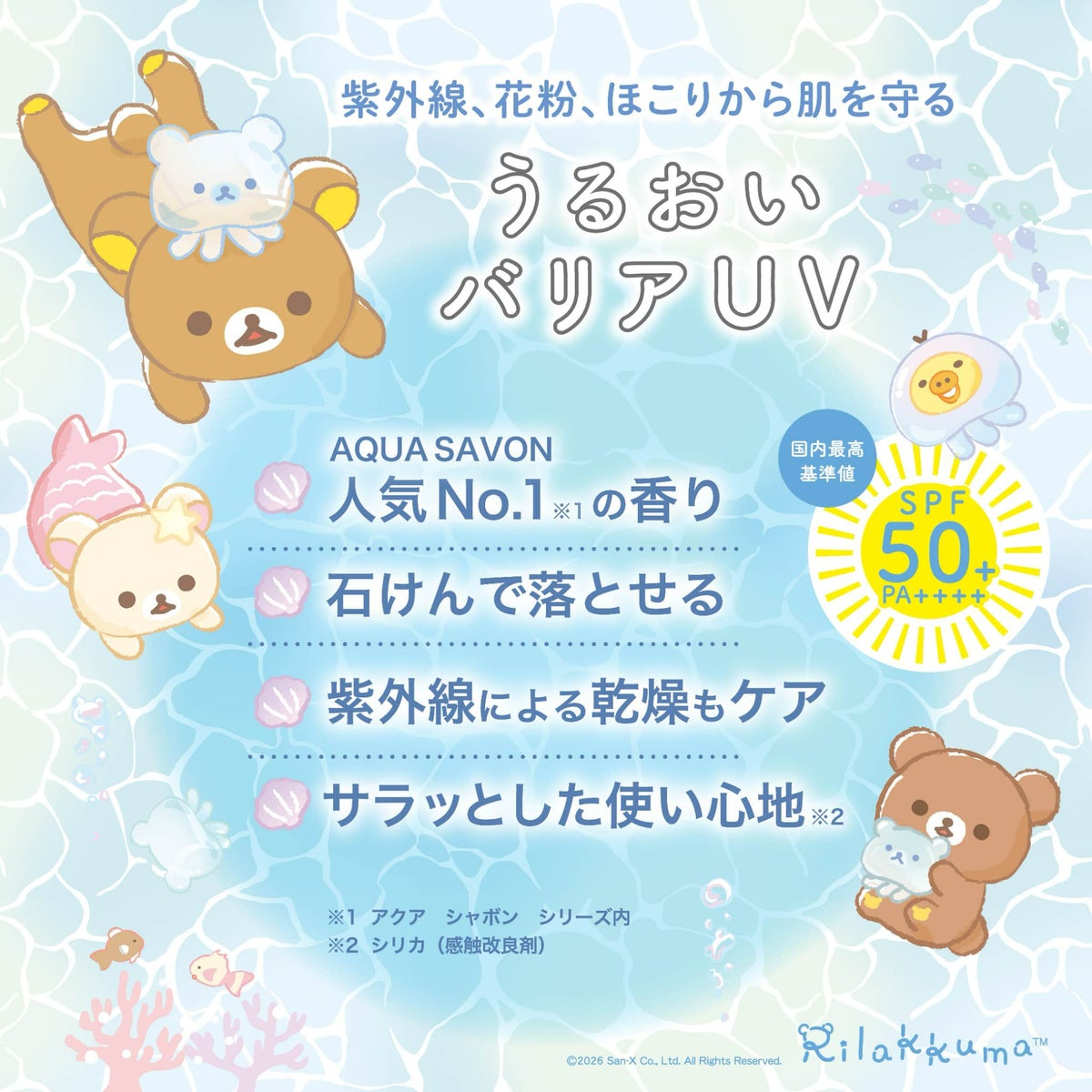 他の画像を見る 心やすらぐ、シャボンな毎日。AQUA SAVON(アクアシャボン) アクア シャボン バリアUVジェル ウォータリーシャンプーの香り(リラックマ26S) 65g 価格 ¥ 1,540 税込 販売期間 2026/02/05 0:00 〜 お気に入りに登録する