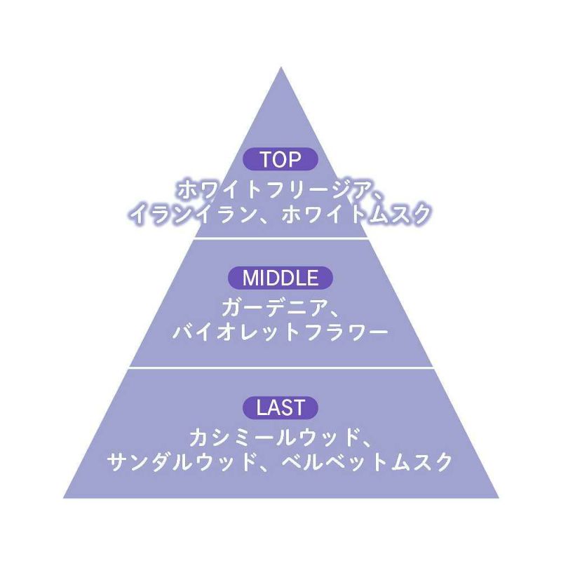 トップから明るく軽やかなホワイトフリージアとイランイランに清潔感のあるムスクが加わり、一瞬でホワイトムスクの世界が広がります。