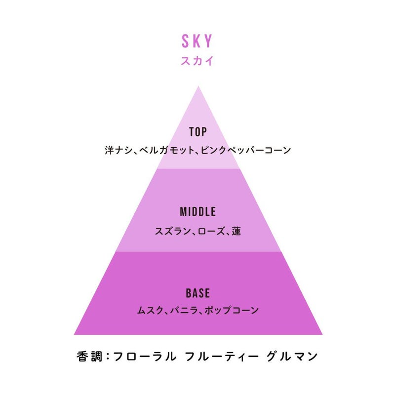 ジューシーな洋ナシ、食欲をそそるベルガモット、そして爽快なピンクペッパーコーンの心地よいトップから始まります。 ミドルでは、ふんわりとしたスズラン、バラ、蓮の花の香りが漂います。 ラストでは、カリカリのポップコーンと温かいバニラの香りが全体を包み込み、トップからラストまで香りの変化をお楽しみいただけます。