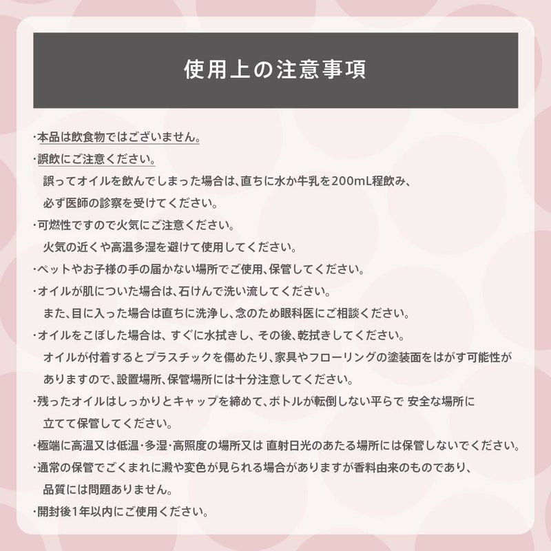 本品は飲食物ではありません。誤飲にご注意ください。謝って液体を飲んでしまった場合は、直ちに水か牛乳を200mLほど飲み、必ず医師の診察を受けてください。可燃性ですので火気にご注意ください。火気の近くや高温多湿を避けて使用してください。ペットやお子様の手の届かない場所でご使用、保管してください。液体が肌についた場合は、石けんで洗い流してください、また、目に入った場合は、ただちに洗浄し、念のため眼科医にご相談ください。液体をこぼさないよう十分ご注意ください。こぼした場合は、すぐに水拭きし、その後、乾拭きしてください。液体が付着すると家具やフローリングの塗装面をはがす可能性がありますので、設置場所には十分注意してください。容器や外装、外装の中の説明書にご使用上の注意やご使用方法が書かれていますので、よく読んでからご使用ください。