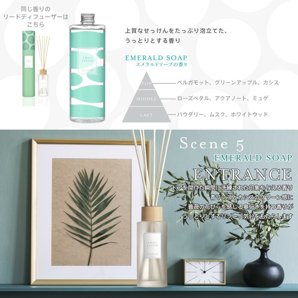他の画像を見る 心やすらぐ、シャボンな毎日。AQUA SAVON 【オンラインストア限定】アクア シャボン リードディフューザー 詰め替え用 フレグランスオイル エメラルドソープの香り 500mL 価格 ¥ 5,500 税込 在庫切れ お気に入りに登録する