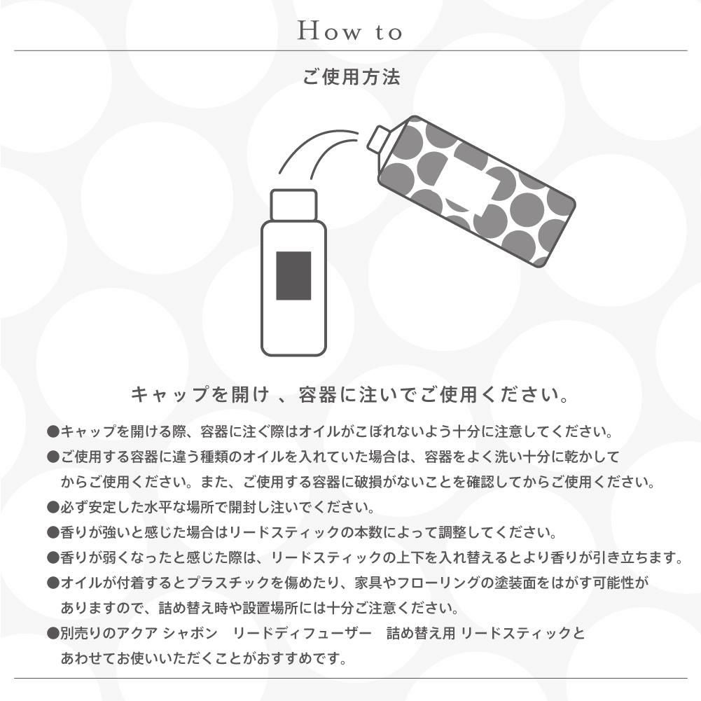 他の画像を見る 心やすらぐ、シャボンな毎日。AQUA SAVON 【オンラインストア限定】アクア シャボン リードディフューザー 詰め替え用 フレグランスオイル ホワイトコットンの香り 500mL 価格 ¥ 5,500 税込 在庫切れ お気に入りに登録する