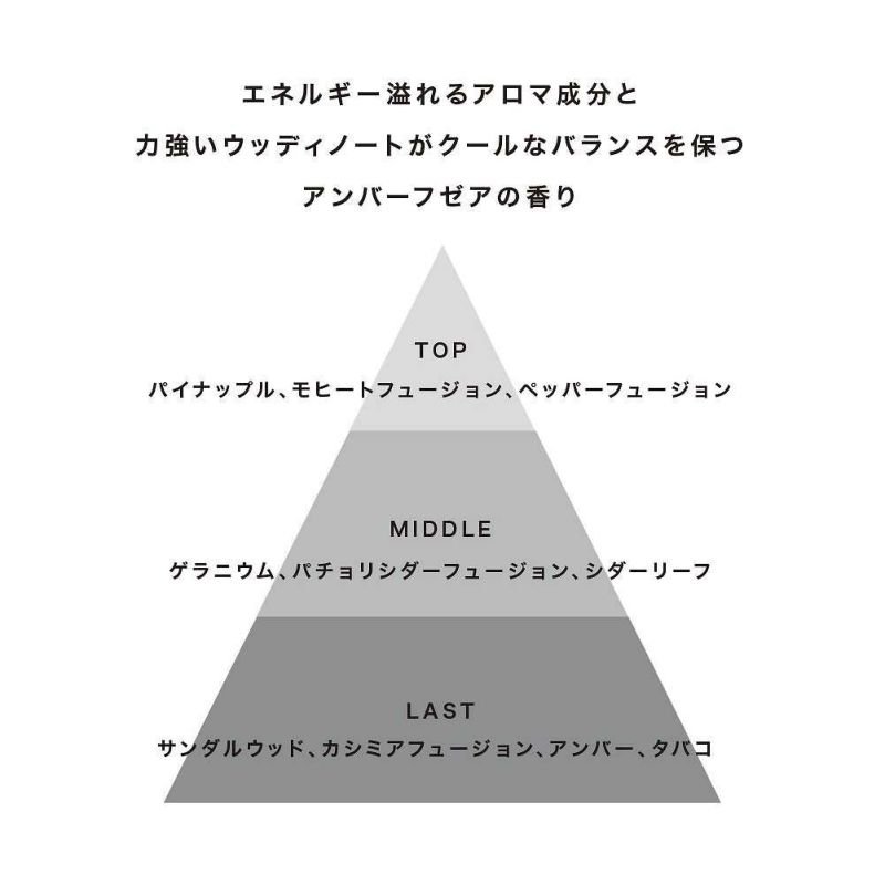 トップでは、ベルガモット、レモン、マンダリンなどのシトラスの香りがウィットに富んだジューシーなパイナップルの香りを引き立て、クールなモヒートアコードにペッパーフュージョンが文字通りスパイスを加えています。ミドルでは、ゲラニウムのクラシックな香りを背景に、シダーリーフの端正で高貴な香りと、パチュリーシダーフュージョンがベルベットのような深みを加えます。ラストでは、アンバーとムスク、そして洗練されたウッドを組み合わせたエレガントで長持ちする香り。クリーミーでスモーキーなサンダルウッドエッセンスが肌と香りを調和させます。