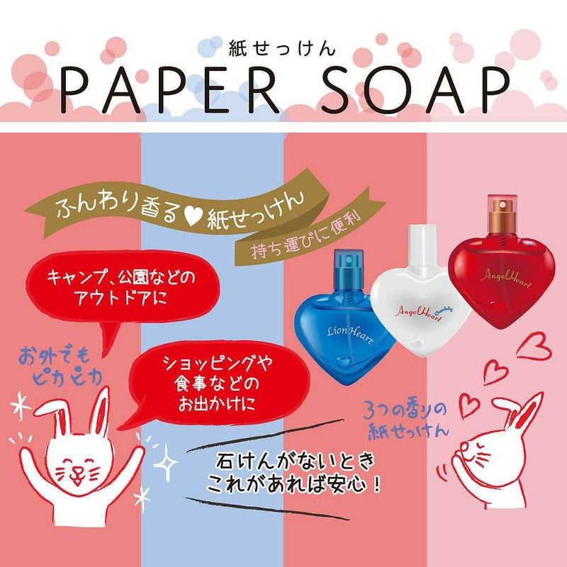 いつでもどこでも使いやすい紙せっけん。ポーチに入れてもコンパクトなパッケージ。ふんわり香るハートがふわふわ泡に変身します!100枚入りなのもポイント!紙せっけんと一緒に健康で美しい毎日を過ごしましょ♥微香性でやさしく香ります。香りは【エンジェルハート&ライオンハート】のセットです。