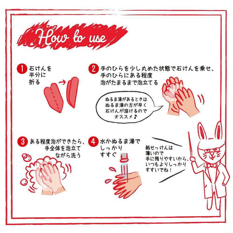 ①乾いた手で1枚ケースから取り出します。 ②紙せっけんを半分に折る ③手のひらを少し丸めた状態で紙せっけんを乗せ、手のひらにある程度泡がたまるまで泡立てる ④水かぬるま湯でしっかりすすぐ ポイント! お水よりぬるま湯のほうがよく泡立ちますよ!